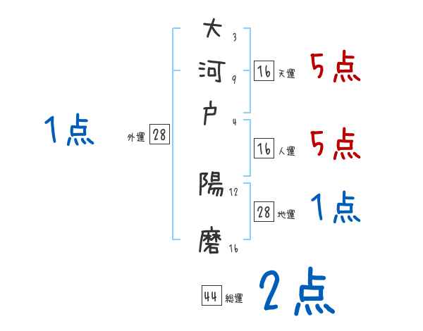 天運![]() | 大河戸陽磨さんの天運は16画の5つ星!人望が厚く大きく発展する。逆転成功が見える。 家系が持つ宿命的な運勢を表します。祖先から受け継いだ苗字ですので自分の力が及びません。家柄を象徴します。 |