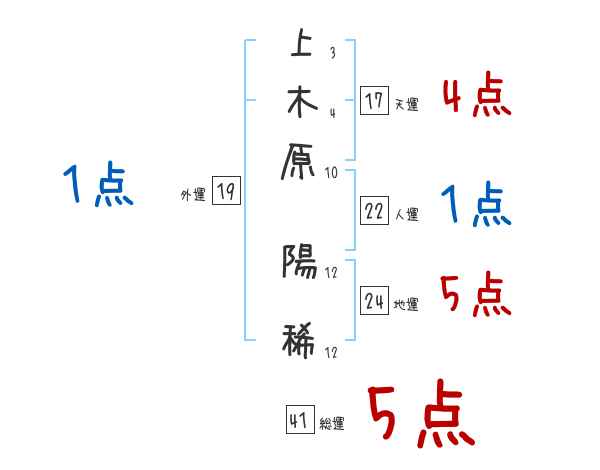 外運![]() | 上木原陽稀さんの外運は19画の1つ星!優れた才能を持ちますが、協調性が足りないことも。周りの人と協力する事を意識しましょう。 生活面を象徴する運勢です。外部から受ける影響力を表し、結婚運、家庭運や職場、環境への順応性を表します。 |
