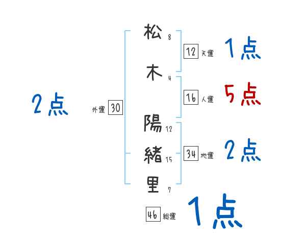 人運![]() | 松木陽緒里さんの人運は16画の5つ星!人望が厚く大きく発展する。逆転成功が見える。 性格や才能などを表す2番目に重要な運勢です。人間関係や協調性、社会的な成功に影響します。主に20歳から50歳ぐらいまでの中年期の運勢を表します。 |