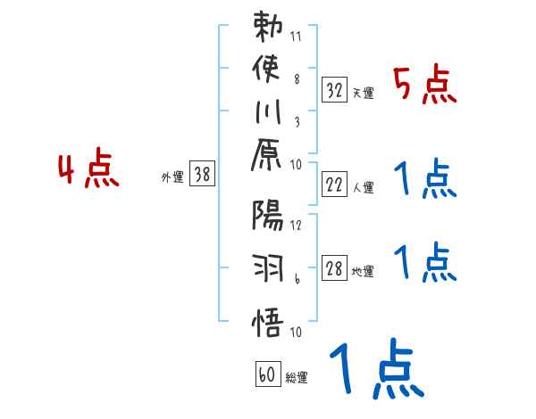 天運![]() | 勅使川原陽羽悟さんの天運は32画の5つ星!柔軟性があり成功する。チャンスが多く金運が良い。 家系が持つ宿命的な運勢を表します。祖先から受け継いだ苗字ですので自分の力が及びません。家柄を象徴します。 |