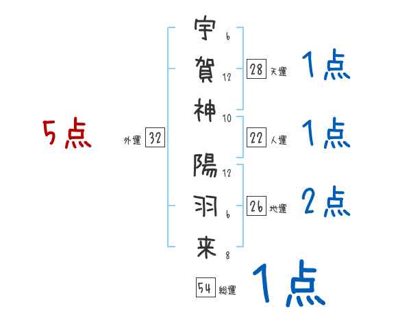 天運![]() | 宇賀神陽羽来さんの天運は28画の1つ星!家庭環境に注意。スポーツで活躍できる能力があるかも。 家系が持つ宿命的な運勢を表します。祖先から受け継いだ苗字ですので自分の力が及びません。家柄を象徴します。 |