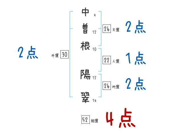 外運![]() | 中曽根陽翠さんの外運は30画の2つ星!浮き沈みの激しさに注意しましょう。 生活面を象徴する運勢です。外部から受ける影響力を表し、結婚運、家庭運や職場、環境への順応性を表します。 |