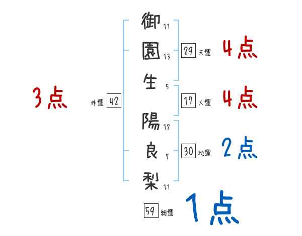 外運![]() | 御園生陽良梨さんの外運は42画の3つ星!病気に注意。多芸であるが消極的でおとなしい。 生活面を象徴する運勢です。外部から受ける影響力を表し、結婚運、家庭運や職場、環境への順応性を表します。 |