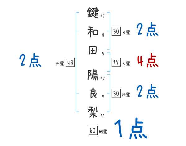 総運![]() | 鍵和田陽良梨さんの総運は60画の1つ星!悲観的で迷いやすい。波乱が多く損をしないように。 あなたの人生を表す1番重要な運勢です。生涯を通じて影響する総合運となり、主に50歳以降の晩年期に影響を及ぼします。 |