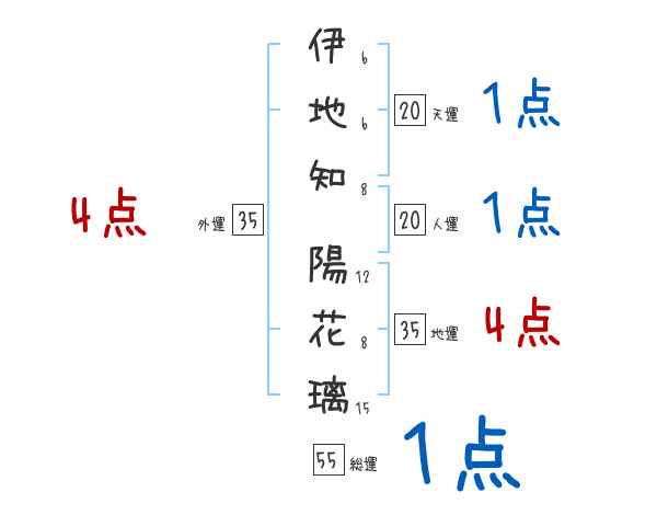 外運![]() | 伊地知陽花璃さんの外運は35画の4つ星!温厚な性格で感受性が高い。穏和な性格で人望が厚い。 生活面を象徴する運勢です。外部から受ける影響力を表し、結婚運、家庭運や職場、環境への順応性を表します。 |