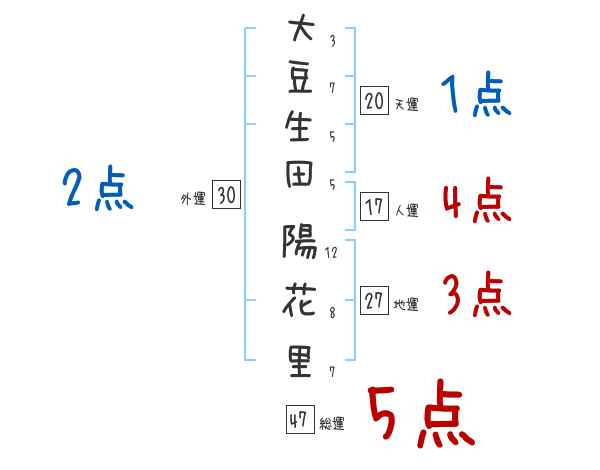 総運![]() | 大豆生田陽花里さんの総運は47画の5つ星!実力が開花し発展する円満な人生。財に恵まれる。 あなたの人生を表す1番重要な運勢です。生涯を通じて影響する総合運となり、主に50歳以降の晩年期に影響を及ぼします。 |