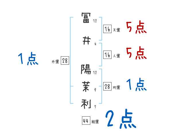 人運![]() | 冨井陽茉利さんの人運は16画の5つ星!人望が厚く大きく発展する。逆転成功が見える。 性格や才能などを表す2番目に重要な運勢です。人間関係や協調性、社会的な成功に影響します。主に20歳から50歳ぐらいまでの中年期の運勢を表します。 |