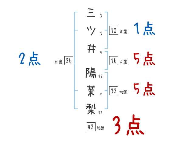 外運![]() | 三ツ井陽茉梨さんの外運は26画の2つ星!波瀾万丈かも。信頼できる人を大事にしましょう。 生活面を象徴する運勢です。外部から受ける影響力を表し、結婚運、家庭運や職場、環境への順応性を表します。 |