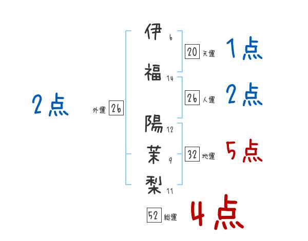 外運![]() | 伊福陽茉梨さんの外運は26画の2つ星!波瀾万丈かも。信頼できる人を大事にしましょう。 生活面を象徴する運勢です。外部から受ける影響力を表し、結婚運、家庭運や職場、環境への順応性を表します。 |