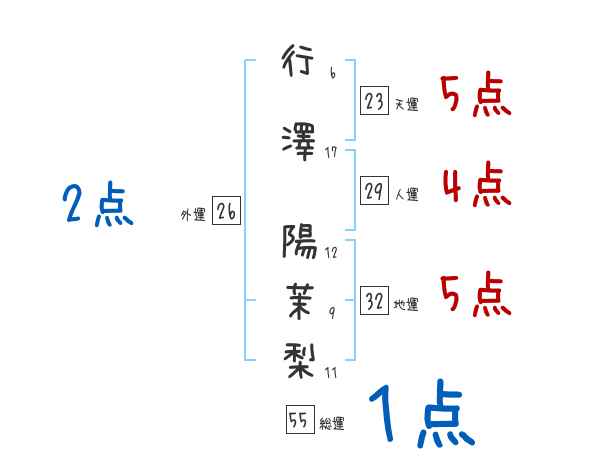 天運![]() | 行澤陽茉梨さんの天運は23画の5つ星!想像力に優れ活力がある。一代で成功し名誉を手に入れる。 家系が持つ宿命的な運勢を表します。祖先から受け継いだ苗字ですので自分の力が及びません。家柄を象徴します。 |