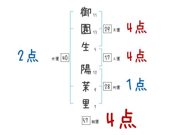 天運![]() | 御園生陽茉里さんの天運は29画の4つ星!完全主義で才能がある。厳格な心の持ち主。 家系が持つ宿命的な運勢を表します。祖先から受け継いだ苗字ですので自分の力が及びません。家柄を象徴します。 |