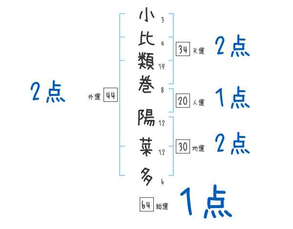 天運![]() | 小比類巻陽菜多さんの天運は34画の2つ星!独創性に優れるが、自尊心が強く災難に注意しましょう。 家系が持つ宿命的な運勢を表します。祖先から受け継いだ苗字ですので自分の力が及びません。家柄を象徴します。 |