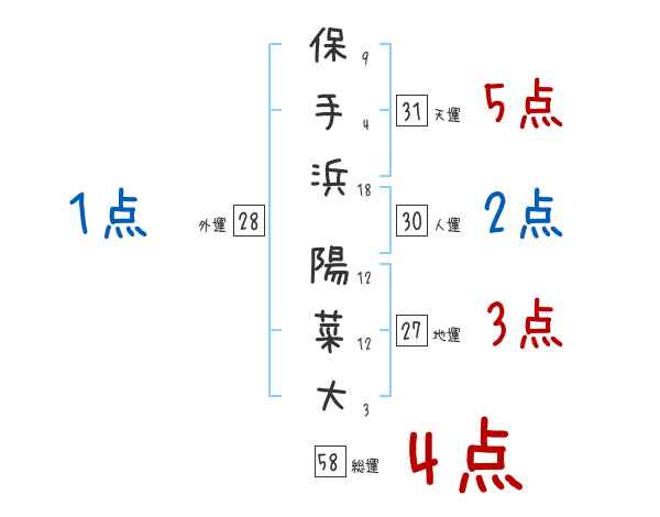 外運![]() | 保手浜陽菜大さんの外運は28画の1つ星!家庭環境に注意。スポーツで活躍できる能力があるかも。 生活面を象徴する運勢です。外部から受ける影響力を表し、結婚運、家庭運や職場、環境への順応性を表します。 |