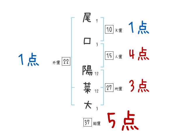 外運![]() | 尾口陽菜大さんの外運は22画の1つ星!努力することが苦手ないっぽう手先が器用。芸術性にも優れる。 生活面を象徴する運勢です。外部から受ける影響力を表し、結婚運、家庭運や職場、環境への順応性を表します。 |