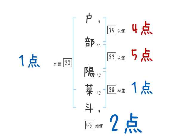 人運![]() | 戸部陽菜斗さんの人運は23画の5つ星!想像力に優れ活力がある。一代で成功し名誉を手に入れる。 性格や才能などを表す2番目に重要な運勢です。人間関係や協調性、社会的な成功に影響します。主に20歳から50歳ぐらいまでの中年期の運勢を表します。 |
