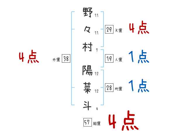 | 外運  | 野々村陽菜斗さんの外運は38画の4つ星!温厚な性格で技術的な才能を発揮する。職人的な仕事に向いている。生活面を象徴する運勢です。外部から受ける影響力を表し、結婚運、家庭運や職場、環境への順応性を表します。 |