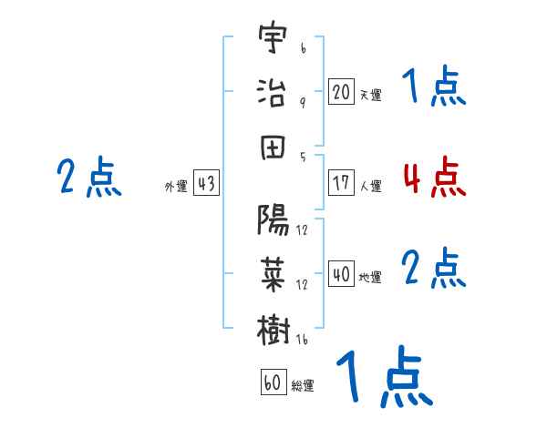 総運![]() | 宇治田陽菜樹さんの総運は60画の1つ星!悲観的で迷いやすい。波乱が多く損をしないように。 あなたの人生を表す1番重要な運勢です。生涯を通じて影響する総合運となり、主に50歳以降の晩年期に影響を及ぼします。 |