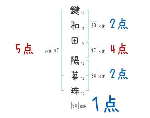 鍵和田陽菜珠さんの総運は64画の1つ星