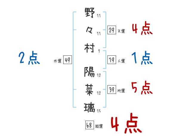 天運![]() | 野々村陽菜璃さんの天運は29画の4つ星!完全主義で才能がある。厳格な心の持ち主。 家系が持つ宿命的な運勢を表します。祖先から受け継いだ苗字ですので自分の力が及びません。家柄を象徴します。 |