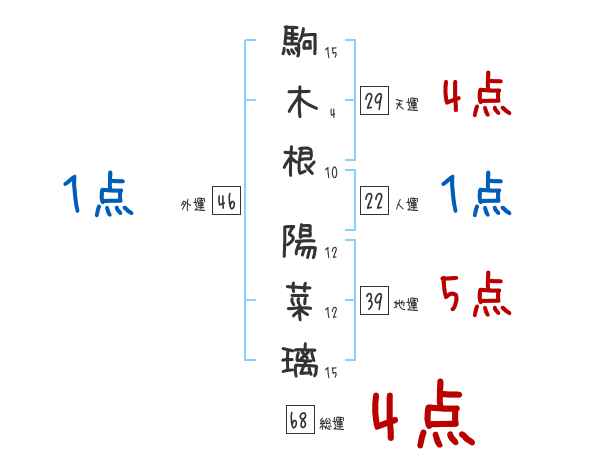 天運![]() | 駒木根陽菜璃さんの天運は29画の4つ星!完全主義で才能がある。厳格な心の持ち主。 家系が持つ宿命的な運勢を表します。祖先から受け継いだ苗字ですので自分の力が及びません。家柄を象徴します。 |