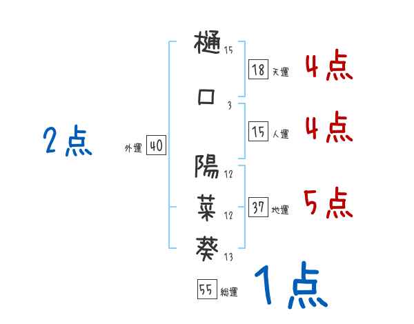 外運![]() | 樋口陽菜葵さんの外運は40画の2つ星!自信過剰で物事に固執するためトラブルに注意。 生活面を象徴する運勢です。外部から受ける影響力を表し、結婚運、家庭運や職場、環境への順応性を表します。 |