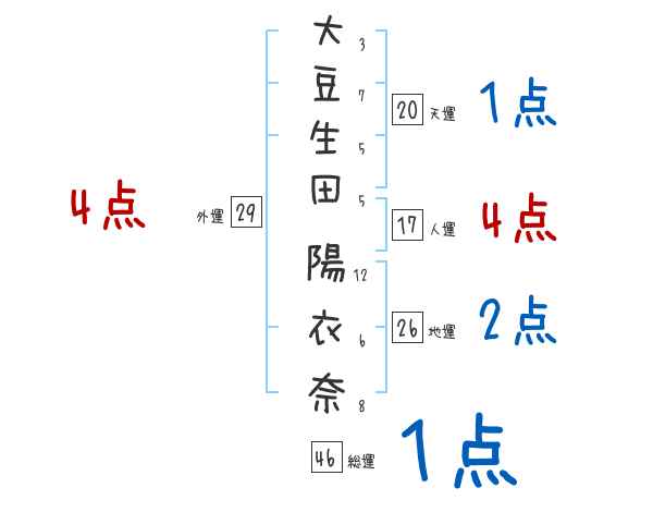 総運![]() | 大豆生田陽衣奈さんの総運は46画の1つ星!迷走することが多く苦労するかも。目先のことにとらわれないように。 あなたの人生を表す1番重要な運勢です。生涯を通じて影響する総合運となり、主に50歳以降の晩年期に影響を及ぼします。 |