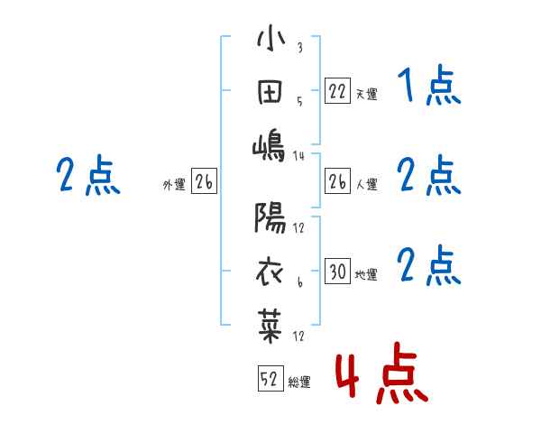 外運![]() | 小田嶋陽衣菜さんの外運は26画の2つ星!波瀾万丈かも。信頼できる人を大事にしましょう。 生活面を象徴する運勢です。外部から受ける影響力を表し、結婚運、家庭運や職場、環境への順応性を表します。 |