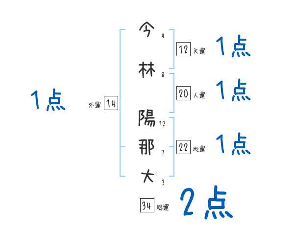 外運![]() | 今林陽那大さんの外運は14画の1つ星!人に対して優しいがストレスを溜め込みがち。人間関係のトラブルを避けるよう気をつけましょう。 生活面を象徴する運勢です。外部から受ける影響力を表し、結婚運、家庭運や職場、環境への順応性を表します。 |