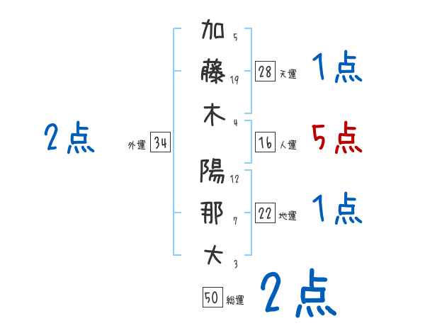 天運![]() | 加藤木陽那大さんの天運は28画の1つ星!家庭環境に注意。スポーツで活躍できる能力があるかも。 家系が持つ宿命的な運勢を表します。祖先から受け継いだ苗字ですので自分の力が及びません。家柄を象徴します。 |