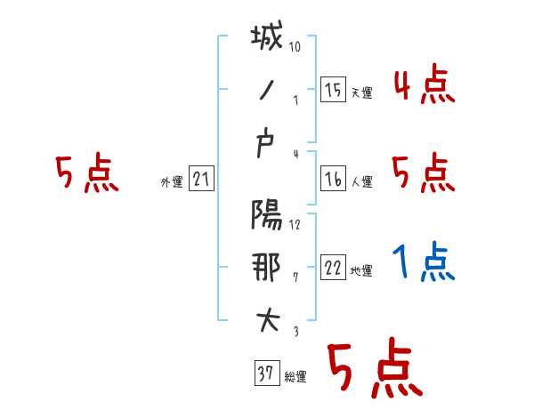 地運![]() | 城ノ戸陽那大さんの地運は22画の1つ星!努力することが苦手ないっぽう手先が器用。芸術性にも優れる。 個性を表す基礎的な運勢です。性格形成や対人関係、行動力など家庭環境に影響されます。主に誕生してから20歳くらいまでの若年期の運勢を表します。 |