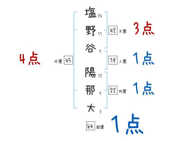 天運![]() | 塩野谷陽那大さんの天運は42画の3つ星!病気に注意。多芸であるが消極的でおとなしい。 家系が持つ宿命的な運勢を表します。祖先から受け継いだ苗字ですので自分の力が及びません。家柄を象徴します。 |
