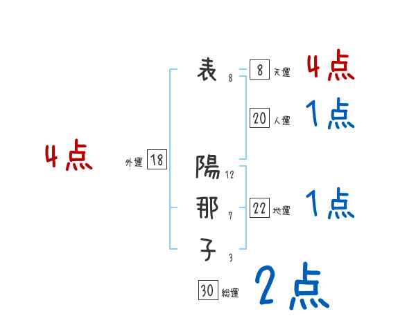 天運![]() | 表陽那子さんの天運は8画の4つ星!勤勉家。根気強く努力し成功する。忍耐力がある。 家系が持つ宿命的な運勢を表します。祖先から受け継いだ苗字ですので自分の力が及びません。家柄を象徴します。 |