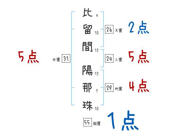 天運![]() | 比留間陽那珠さんの天運は26画の2つ星!波瀾万丈かも。信頼できる人を大事にしましょう。 家系が持つ宿命的な運勢を表します。祖先から受け継いだ苗字ですので自分の力が及びません。家柄を象徴します。 |