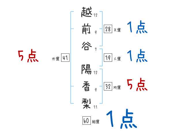 地運![]() | 越前谷陽香梨さんの地運は32画の5つ星!柔軟性があり成功する。チャンスが多く金運が良い。 個性を表す基礎的な運勢です。性格形成や対人関係、行動力など家庭環境に影響されます。主に誕生してから20歳くらいまでの若年期の運勢を表します。 |