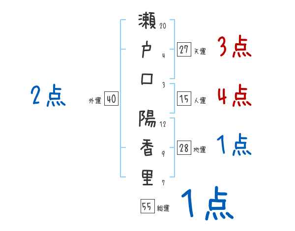 総運![]() | 瀬戸口陽香里さんの総運は55画の1つ星!欲張りな性格で軽率な行動に注意しましょう。病気に気をつけて。 あなたの人生を表す1番重要な運勢です。生涯を通じて影響する総合運となり、主に50歳以降の晩年期に影響を及ぼします。 |