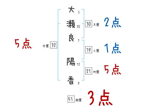 外運![]() | 大瀬良陽香さんの外運は32画の5つ星!柔軟性があり成功する。チャンスが多く金運が良い。 生活面を象徴する運勢です。外部から受ける影響力を表し、結婚運、家庭運や職場、環境への順応性を表します。 |