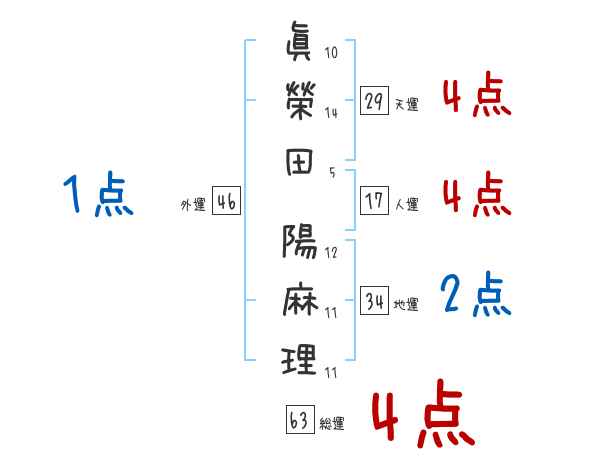 天運![]() | 眞榮田陽麻理さんの天運は29画の4つ星!完全主義で才能がある。厳格な心の持ち主。 家系が持つ宿命的な運勢を表します。祖先から受け継いだ苗字ですので自分の力が及びません。家柄を象徴します。 |