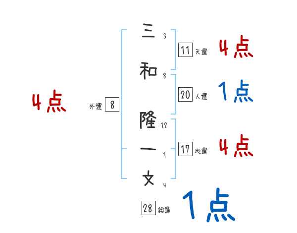 天運![]()  | 三和隆一文さんの天運は11画の4つ星!着実に富や地位を得る幸運な人生。 家系が持つ宿命的な運勢を表します。祖先から受け継いだ苗字ですので自分の力が及びません。家柄を象徴します。 |
