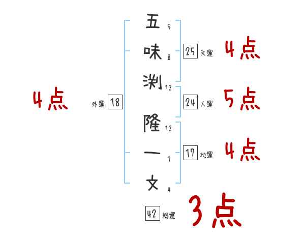 天運![]() | 五味渕隆一文さんの天運は25画の4つ星!個性があり才能があふれる。強運の持ち主で発展する。 家系が持つ宿命的な運勢を表します。祖先から受け継いだ苗字ですので自分の力が及びません。家柄を象徴します。 |