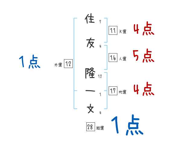 | 総運  | 住友隆一文さんの総運は28画の1つ星!家庭環境に注意。スポーツで活躍できる能力があるかも。あなたの人生を表す1番重要な運勢です。生涯を通じて影響する総合運となり、主に50歳以降の晩年期に影響を及ぼします。 |