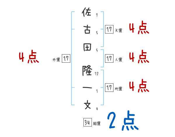 天運![]() | 佐古田隆一文さんの天運は17画の4つ星!積極的な行動力。地位を気づき財産を手に入れる。純粋な心と直感力。 家系が持つ宿命的な運勢を表します。祖先から受け継いだ苗字ですので自分の力が及びません。家柄を象徴します。 |
