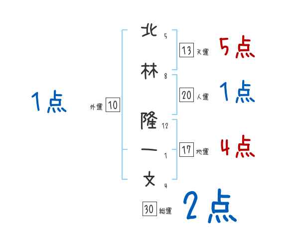 総運![]() | 北林隆一文さんの総運は30画の2つ星!浮き沈みの激しさに注意しましょう。 あなたの人生を表す1番重要な運勢です。生涯を通じて影響する総合運となり、主に50歳以降の晩年期に影響を及ぼします。 |