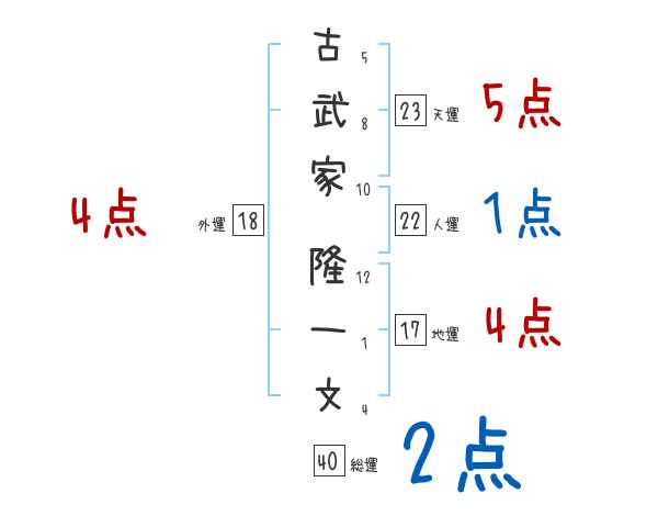 天運![]() | 古武家隆一文さんの天運は23画の5つ星!想像力に優れ活力がある。一代で成功し名誉を手に入れる。 家系が持つ宿命的な運勢を表します。祖先から受け継いだ苗字ですので自分の力が及びません。家柄を象徴します。 |