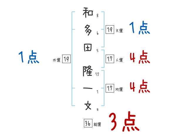 総運![]() | 和多田隆一文さんの総運は36画の3つ星!先見性が豊かです。多少神経質で苦労することも。 あなたの人生を表す1番重要な運勢です。生涯を通じて影響する総合運となり、主に50歳以降の晩年期に影響を及ぼします。 |