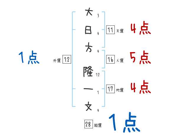 人運![]() | 大日方隆一文さんの人運は16画の5つ星!人望が厚く大きく発展する。逆転成功が見える。 性格や才能などを表す2番目に重要な運勢です。人間関係や協調性、社会的な成功に影響します。主に20歳から50歳ぐらいまでの中年期の運勢を表します。 |