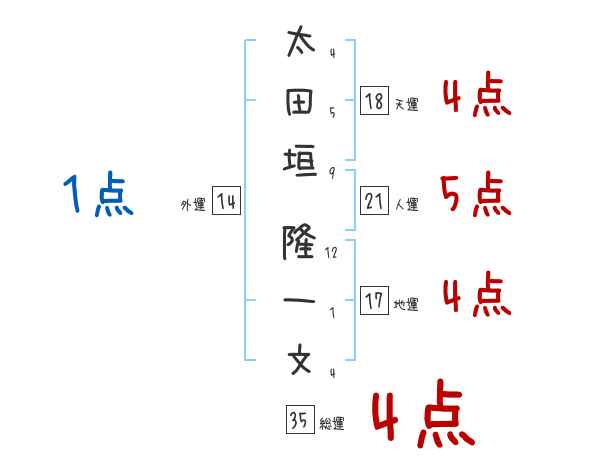 天運![]() | 太田垣隆一文さんの天運は18画の4つ星!情熱的で剛気。忍耐力があり信頼される。 家系が持つ宿命的な運勢を表します。祖先から受け継いだ苗字ですので自分の力が及びません。家柄を象徴します。 |