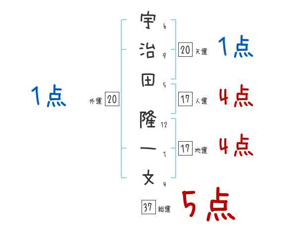 人運![]() | 宇治田隆一文さんの人運は17画の4つ星!積極的な行動力。地位を気づき財産を手に入れる。純粋な心と直感力。 性格や才能などを表す2番目に重要な運勢です。人間関係や協調性、社会的な成功に影響します。主に20歳から50歳ぐらいまでの中年期の運勢を表します。 |
