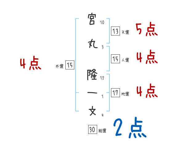 総運![]() | 宮丸隆一文さんの総運は30画の2つ星!浮き沈みの激しさに注意しましょう。 あなたの人生を表す1番重要な運勢です。生涯を通じて影響する総合運となり、主に50歳以降の晩年期に影響を及ぼします。 |