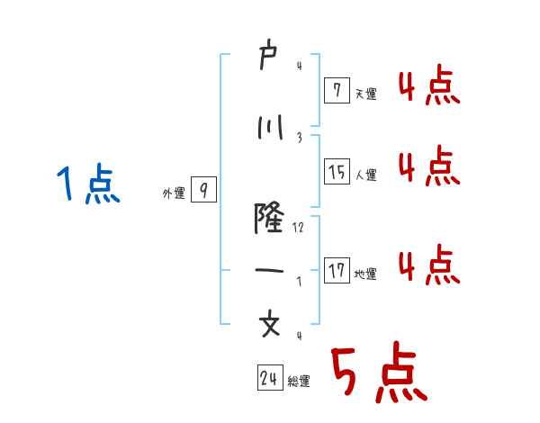 天運![]() | 戸川隆一文さんの天運は7画の4つ星!強い意志や信念を持ち独立心が強い。自立する。 家系が持つ宿命的な運勢を表します。祖先から受け継いだ苗字ですので自分の力が及びません。家柄を象徴します。 |