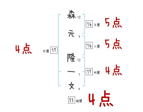 総運![]() | 森元隆一文さんの総運は33画の4つ星!権力志向でプライドが高い。勇気があり運を切り開き成功する。 あなたの人生を表す1番重要な運勢です。生涯を通じて影響する総合運となり、主に50歳以降の晩年期に影響を及ぼします。 |